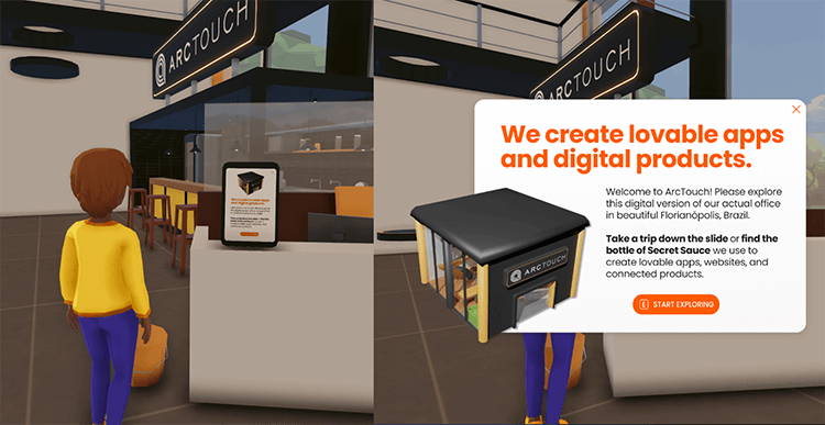 In ArcTouch’s virtual office, a welcome message encourages the user to explore.